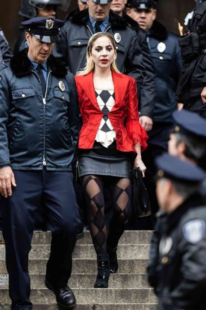 On Saturday morning, the pop star was photographed in costume while shooting a scene outside of City Hall in New York City. In the snapshot, Gaga is being escorted by police officers down the steps of the courthouse, wearing a bright red blazer with ruffled cuffs over a black-and-white checkered corseted top and a black leather miniskirt with zippers on each side. She accessorized with sheer diamond-patterned stockings, a black handbag, and matching patent leather heeled boots.